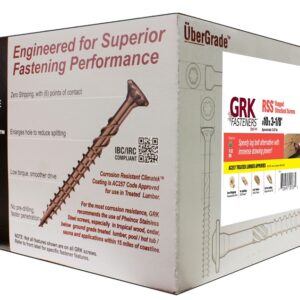 GRK's RSSâ⢠screw is made of specially hardened steel to provide you with high tensile, torque and shear strength. The sharp threads and points bite instantly into the material (including hardwood), reducing the splitting effect due to smaller shanks. RSSâ⢠screws that are 3-1/8 in and longer have CEE threads which enlarge the screw hole for the non-threaded portion of the fastener, allowing the wood to settle easily and increases the screw's drawing strength. The CEE thread also reduces the friction on the screw shank which can result in lowering the driving torque and the likelihood of splitting the wood. This is why the RSSâ⢠screw is an efficient lag screw alternative. Our round head with built-in shield (washer type head) has no sharp edges like conventional lag screws. The added shoulder (nominal diameter) underneath the washer has the ability to center the RSSâ⢠screw in pre-drilled hardware like hinges and connector plates.