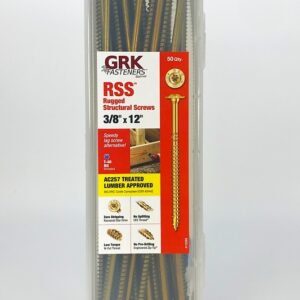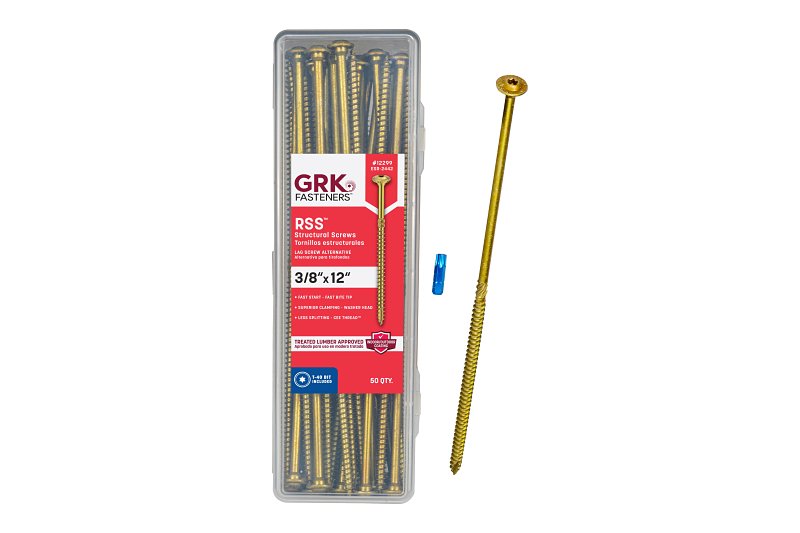 GRK's RSSâ⢠screw is made of specially hardened steel to provide you with high tensile, torque and shear strength. The sharp threads and points bite instantly into the material (including hardwood), reducing the splitting effect due to smaller shanks. RSSâ⢠screws that are 3-1/8 in and longer have CEE threads which enlarge the screw hole for the non-threaded portion of the fastener, allowing the wood to settle easily and increases the screw's drawing strength. The CEE thread also reduces the friction on the screw shank which can result in lowering the driving torque and the likelihood of splitting the wood. This is why the RSSâ⢠screw is an efficient lag screw alternative. Our round head with built-in shield (washer type head) has no sharp edges like conventional lag screws. The added shoulder (nominal diameter) underneath the washer has the ability to center the RSSâ⢠screw in pre-drilled hardware like hinges and connector plates.Item Specifications