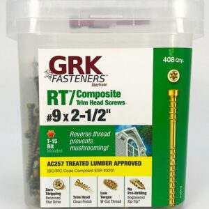 GRK Fasteners RT Screw, Thread Size: #9, 2-1/2 in L, Thread Type: Reverse, Head Type: Trim, Drive Type: Star, Steel, Package Quantity: 408 PAIL, Thread Length: 1.575 in, Drive Size: T-15, Applicable Materials: Composite, Wood, Shear Strength: 425 lb, 576 lb Tensile StrengthItem Specifications