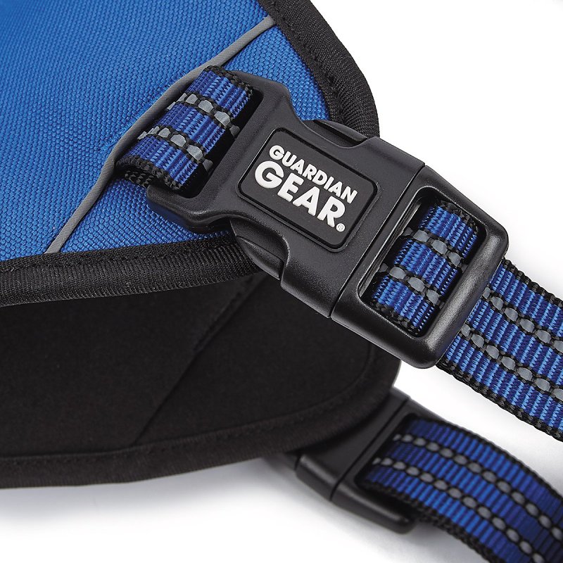 Guardian Gear® reflective nylon harnesses are constructed with durable high-quality nylon and reflective stitching with high tensile force plastic fittings. Straps connect at chest with a steel O-Ring for security. Fully padded for comfort and fit. Padded handle for comfortable and secure handling.