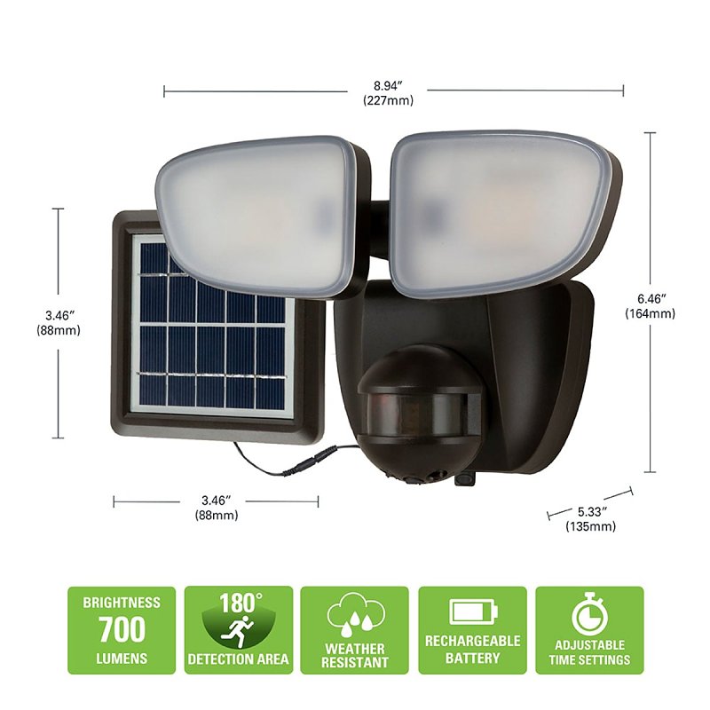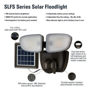 The SFLS series solar powered outdoor security light provides the comfort of a security light, without the hassle of wiring a conventional fixture. Available in 700, 1000, 1500 and 2000 Lumens motion activated fixture. Integrated LEDs are rated at 50000 hr for maintenance-free operation. This product is ideal for wall or eave mount. Integrated 180 deg motion sensor automatically turns the light on when motion is detected (Dusk to Dawn). Polycrystalline solar panel with 16 ft cord allows for optimal placement in direct sunlight for excellent performance. This flood light is ideal for walkways, yards, patios and driveways creating an inviting exterior space as well as providing safety and security. Available in bronze and white finishes.