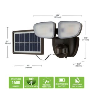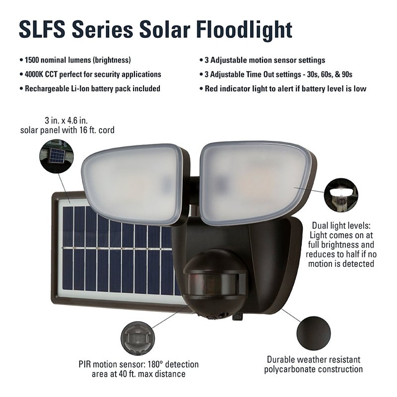 The SFLS series solar powered outdoor security light provides the comfort of a security light, without the hassle of wiring a conventional fixture. Available in 700, 1000, 1500 and 2000 Lumens motion activated fixture. Integrated LEDs are rated at 50,000 hr for maintenance free operation. This product is ideal for wall or eave mount. Integrated 180 deg motion sensor automatically turns the light on when motion is detected (Dusk to Dawn). Polycrystalline solar panel with 16 ft cord allows for optimal placement in direct sunlight for high-level performance. This flood light is ideal for walkways, yards, patios and driveways creating an inviting exterior space as well as providing safety and security. Available in bronze and white finishes.
