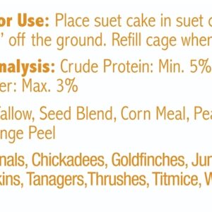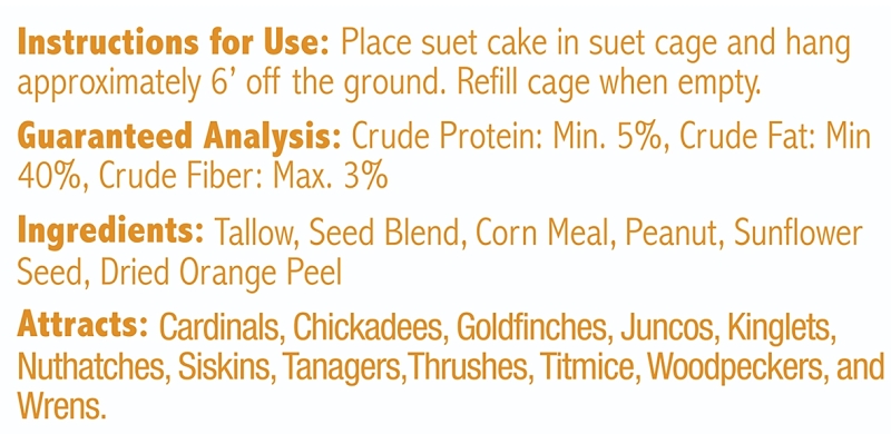 Heath Wild Bird Seed, Crafted Suet, Cake, Net Content: 11.75 oz, Pack, Attracts: Colorful Songbirds, Ingredients: Orange Peel, Peanuts, Seeds, Sunflower SeedsItem Specifications