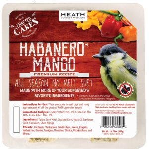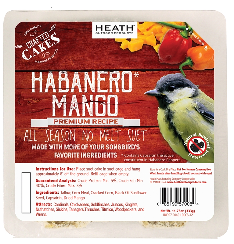 Heath Wild Bird Food, Suet Cake, Flavor: Habanero Mango, Net Content: 11.75 oz, Attracts: Cardinals, Chickadees, Goldfinches, Juncos, Kinglets, Nuthatches, Siskins, Tanagers, Thrushes, Titmice, Woodpeckers, Wrens, Ingredients: Tallow, Corn Meal, Cracked Corn, Black Oil, Sunflower Seeds, Capsaicin, Dried Mango, Nutritional Information: 5% Crude Protein (Min), 40% Crude Fat (Min), 3% Crude Fiber (Max)Item Specifications