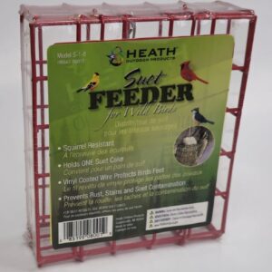 The Heath Outdoor Products suet feeder makes offering suet easy. The vinyl-coated metal cage is safe for birds, weather-resistant, rust-resistant and designed for use with standard-sized suet and small seed cakes. The front panel opens for quick and easy filling.Item Specifications