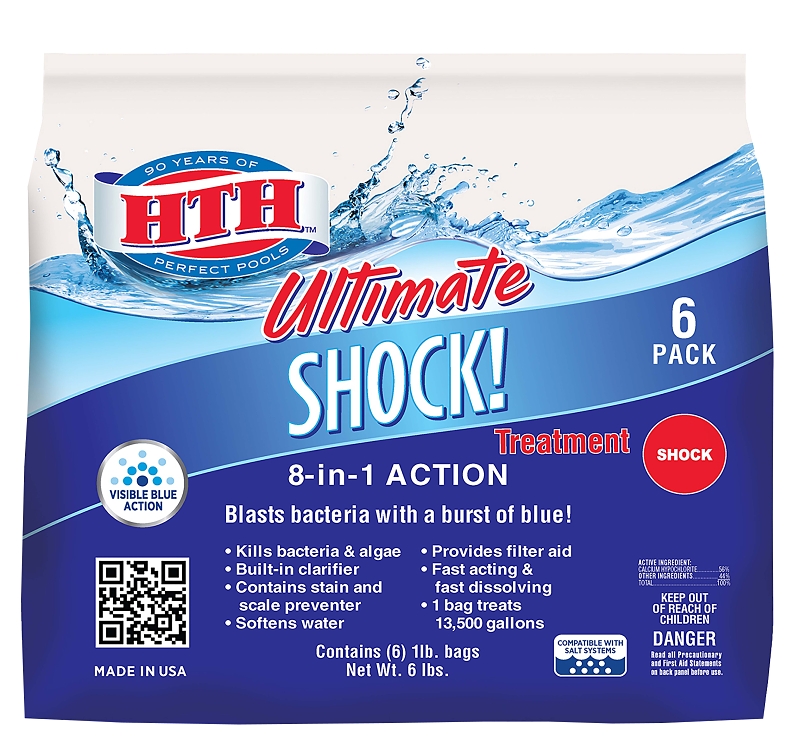HTH® Ultimate Shock! treatment delivers an incredible value with a 8-in-1 formula that increases chlorine levels, kills and prevents bacteria and algae, reduces eye and skin irritation, prevents stains from metals and prevents scale. HTH® makes pool care easy with a shock treatment that you can apply directly to the pool and see crystal clear results in just 24 hr. This pool shock is ideal for all pool surfaces and won't fade your vinyl pool liner. You can also use this swimming pool shock in your salt water pool for the same sparkling clear results.