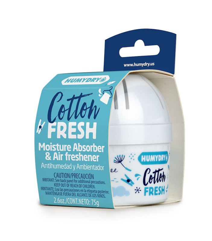 Humydry® mini cotton fresh moisture absorber and air freshener is 2 functions in one. It absorbs moisture and freshens the air at the same time. Our moisture absorber works as a non-electric dehumidifiers to help lower excess humidity which protects against condensation and musty odors and creates a healthy indoor environment (40 to 60%). The air freshener has a cotton fresh fragrance. Suitable for small spaces, bathroom, closets, offices, lockers, etc.