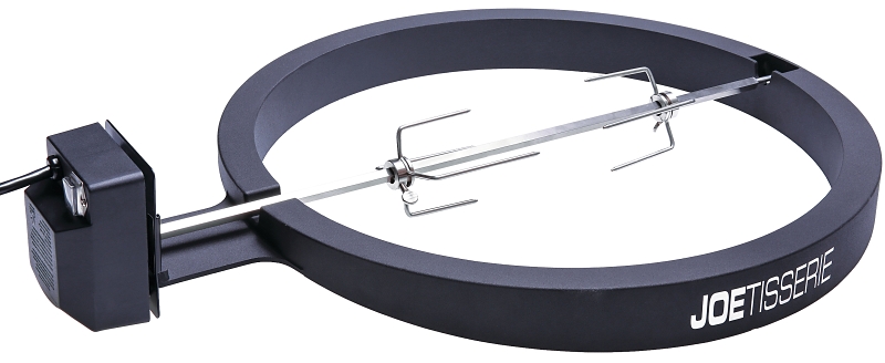 The innovative JoeTisserie transforms your Kamado Joe Big Joe into a rotisserie-style grill. The spit rod and forks are constructed from durable, 304 grade stainless steel and are adjustable for perfect balance and steady rotation. The unique cast aluminum ring is thicker on the front and thinner towards the back of the grill, which allows the Kamado lid to close. The spit rod and forks are constructed from durable, 304 grade stainless steel and are adjustable for perfect balance and steady rotation. Turn up to 50 lb of beef, pork or chicken with powerful yet quiet 120 V motor. The rotisserie kit is easy to install and dishwasher safe for easy clean-up.Item Specifications