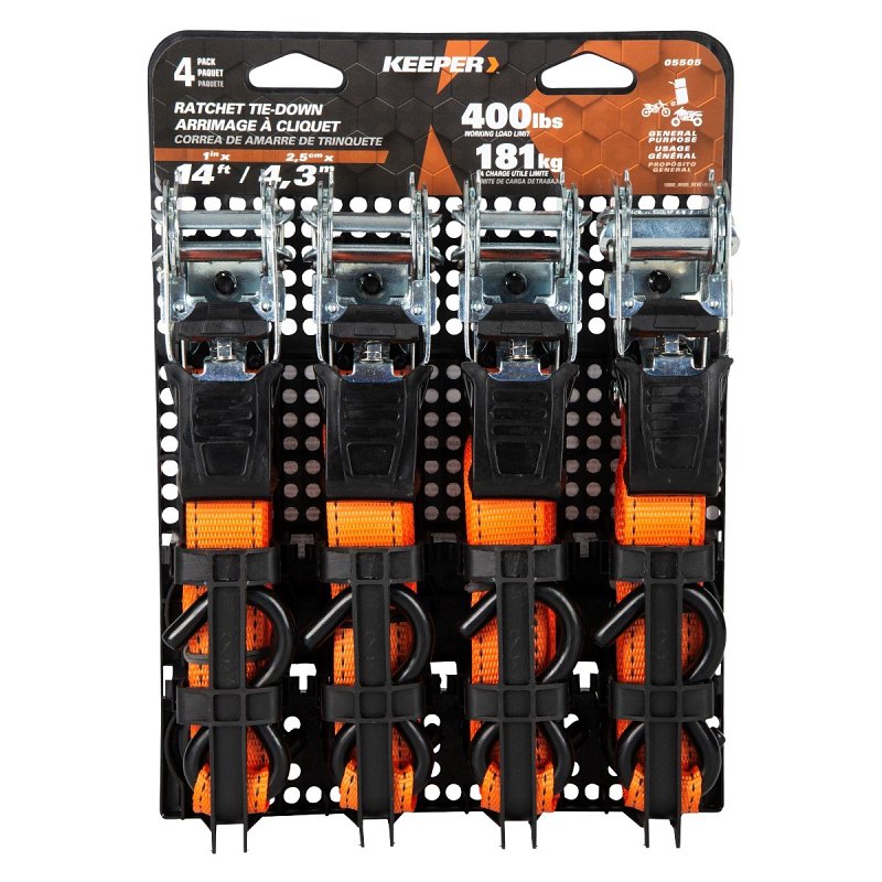 Keeper® Performance Engineered® 14 ft x 1 in ratchet tie-downs provide a safer, more efficient alternative to rope and other inferior cargo securing methods. Mid-sized ratchet tie-downs with a 400 lb working load limit and 1200 lb break strength are ideal for securing loads with pickup trucks and utility trailers. For demanding conditions, ratchet tie-downs are ideal because they maximize tension. The design of Keeper® ratchets puts safety and security first with a spring-loaded release that ensures the ratchet will never open accidentally. Vinyl-coated S-hooks are rust-resistant for increased life and Hi-Test® webbing resists rot and abrasion. Keeper® ratchet tie-downs are an ideal solution for everyday mid-sized load security.