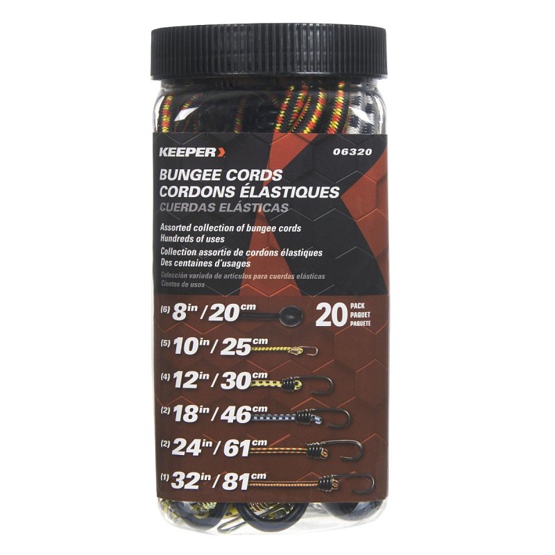 Keeper® bungee cords are made from the highest quality materials for long-lasting dependability no matter what the application. All Keeper® bungee cords are designed to withstand UV rays and weather damage with durable outer jackets in bright, visible colors. Inside, premium rubber ensures top quality performance and outstanding toughness. Heavy gauge steel hooks at both ends are coated with a protective vinyl covering, which prevents rust and ensures that hooks will never damage paint or scratch metal. Keeper® bungee cords are strong enough to be relied on whenever they're needed. 20-Piece jar contains (5) 10 minis, (4) 12 in, (2) 18 in, (2) 24 in, (1) 32 in, 6 bungee balls.