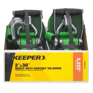 Keeper® 30 ft x 2 in Heavy-duty ratchet tie-downs are engineered to meet D.O.T., California Highway Patrol and Web Sling Association standards and are the ideal choice for industrial cargo control. It features molded EZ release ratchet handles, double J-hooks and an abrasion-resistant Hi-Test® webbing. Perfect for large-demanding cargos needs and a variety of applications.Item Specifications