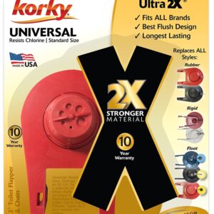 The Korky ultra 2X flapper is long-lasting, most universal 2 in flapper available. The proprietary chlorazone-II rubber formulation lasts 2X longer than other flappers and is backed by a 10 years warranty to hold up in the harshest environments. Korky red rubber resists chlorine, bacteria, city water treatment, hard water and well water. The toilet flapper adjusts to match original toilet settings and eliminates water waste by decreasing the amount of water flushed. Ideal for all standard 2 in toilets, including 1.28, 1.6, 3.5 and 5 gpf. The adjustable toilet flapper has multiple settings to ensure it fits popular 2 in toilet models. Made of flexible rubber for a tight seal and easy to install.