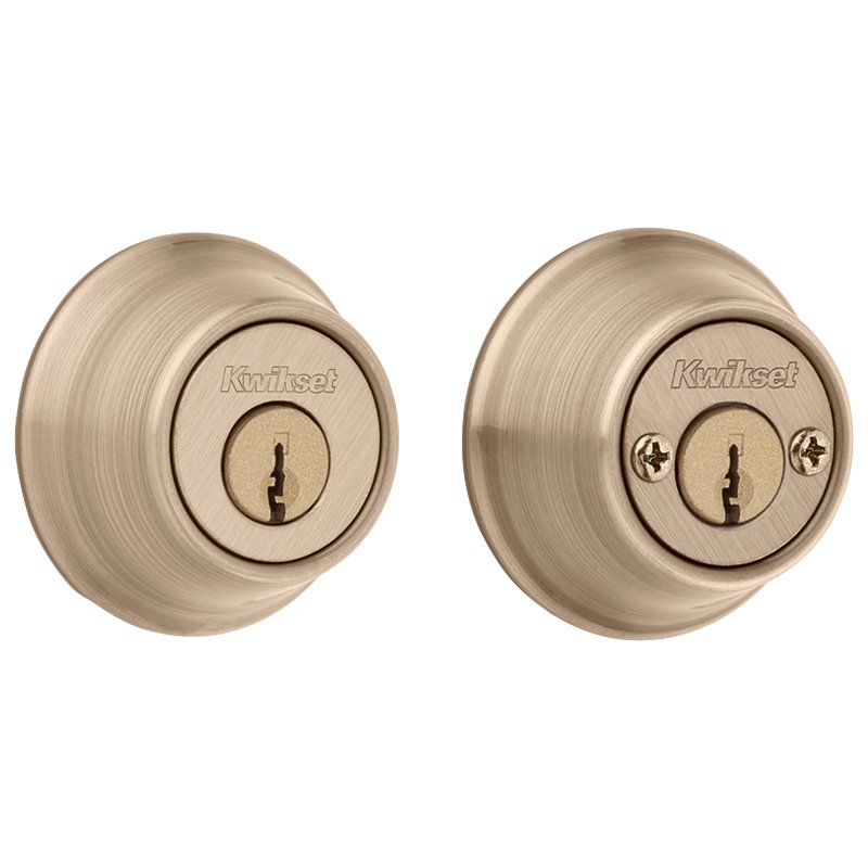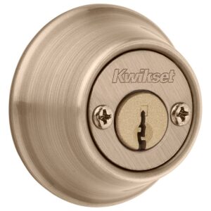 Kwikset 600 Series Deadbolt, Design: Traditional, Security Grade: 3, Number of Cylinders: 2, Cylinder Type: Pin, Tumbler, Keyway Type: KW1, Key Type: Keyed, Strike Type: Round Corner, Strike Size: 2-1/4 x 1 in, Backset Type: Adjustable, Backset Size: 2-3/8 to 2-3/4 in, Latch Type: Adjustable, Round Corner, Faceplate Size: 1 x 2-1/4 in, Throw Length: 1 in, Cross Bore Diameter: 2-1/8 in, Edge Bore Diameter: 1 in, Door Thickness: 1-3/8 to 1-3/4 in, Interior Locking: Key, Commercial/Residential: Commercial, Residential, Zinc, Antique Brass, Dimensions: 1-1/16 in L x 2-7/16 in W x 2-7/16 in H, Includes: (2) Keys, Round Deadbolt Strike, Latch and Screws