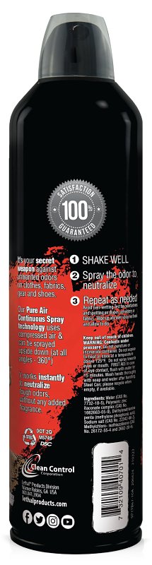 Lethal 360 field spray is your secret weapon against unwanted odors on clothes, fabrics, gear and boots. This is our original field spray on steroids. The pre-mixed formula works instantly to neutralize tough odors, without any fragrance.Item Specifications