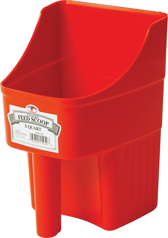 The all-around scoop you'll ever use. Enclosed design reduces spillage and measuring is easy with built-in graduation marks which are ideal for feed, supplements and seed. The flat bottom allows you to set the scoop down without tipping over and makes the scoops stackable for storage. Ample 3 qt size, made of heavy-duty polypropylene for long life.Item Specifications
