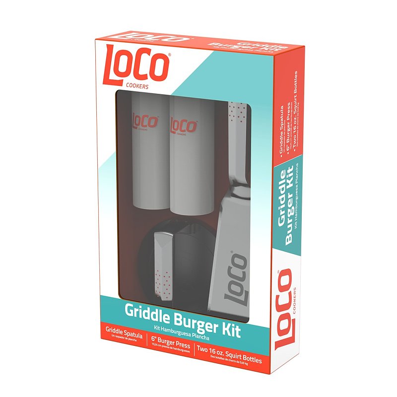 Achieve mouth watering, juicy burgers every time with the LoCo griddle burger kit. Featuring a 6 in cast iron burger press for smash burgers that retains heat, cooking burger evenly and a heavy-duty stainless steel spatula for seamless flipping. Kit also includes two squirt bottles for your favorite condiments which are made of durable BPA-free plastic and specially designed with drip-resistant tips, to assist with cooking and cleanup. Dishwasher safe.Item Specifications