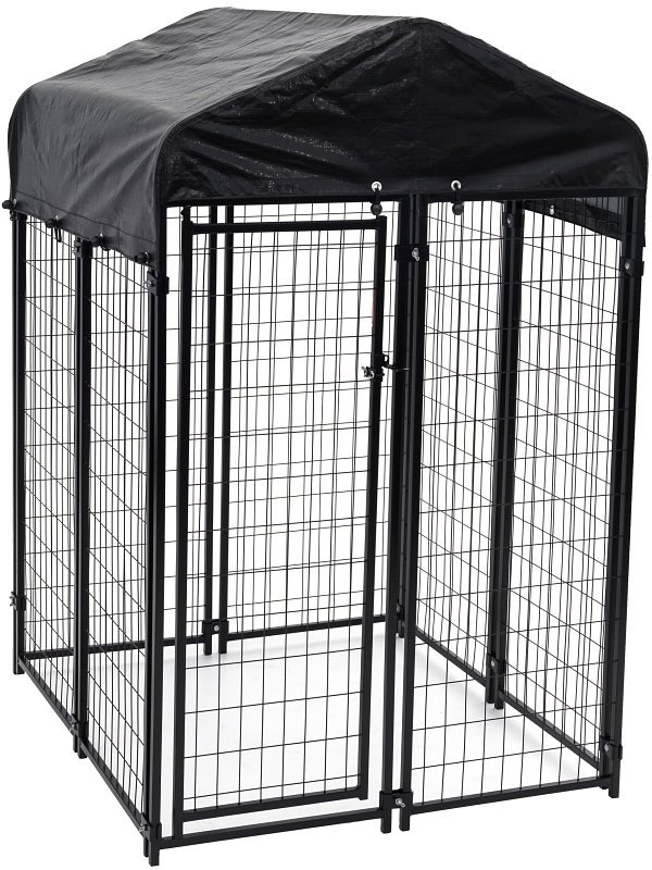 Lucky Dog Kennel, Heavy-Duty, 4 ft Overall Length, 4 ft Overall Width, 6 ft Overall Height, Steel, Black, Powder-Coated, Includes: Includes Rust Resistant Wire, Fully Enclosed Water-Resistant Tarp Cover with Steel Roof Frame, Pre-Assembled Panels and Gate, Dog-safe Lockable Gate Latch, Assembly Clamps