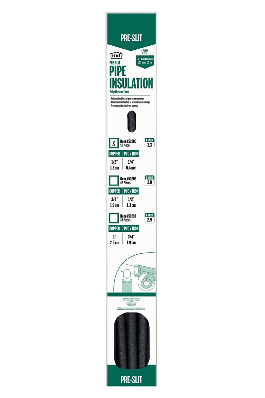 M-D Prep-Slit Tube Pipe Insulation, 6 ft Length, 1/2 in Thickness, Polyethylene, Black, 5/8 in Pipe, 40 to 120 deg F, Suitable for: Hot, Cold Pipes