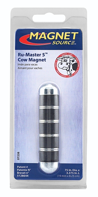 The heavy-duty Ru-Master™ cow magnet features a patented design of 5 powerful magnets strategically assembled with power-enhancing pole pieces for excellent magnetic strength. This magnet does not disassemble.