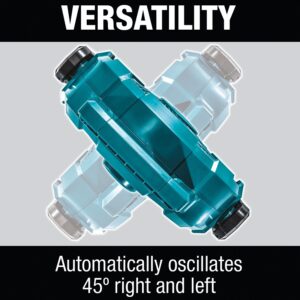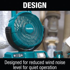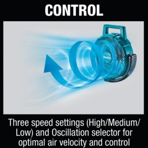 The Makita® 18 V LXT® lithium-ion cordless fan (model DCF203Z) is a powerful and portable solution for painters, contractors and more. The DCF203Z has three settings for optimal air velocity control. It can be powered by Makita® 18 V LXT® lithium-ion batteries or an AC adapter. The fan automatically oscillates 45 deg right and left and manually tilts 90 deg up and 45 deg down for convenience redirection of air flow. It's part of Makita® expanding 18 V LXT® system, the world's largest cordless tool system powered by 18 V lithium-ion batteries. Makita® 18 V LXT® lithium-ion batteries have the fastest charge times in their categories, so they spend more time working and less time sitting on the charger. For improved tool performance and extended battery life, Makita® created Star Protection Computer Controlsâ¢. Star Protection is communication technology that allows the Star Protection equipped tool and battery to exchange data in real time and monitor conditions during use to protect against over loading, over discharging and over heating. For increased versatility, the tool can also be powered by Makita® 18 V LXT® and compact lithium-ion batteries with the star symbol on the battery indicating Star Protection inside.Item Specifications