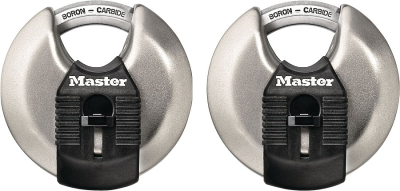 The Master Lock Magnum No.M40XT discus padlocks feature a 2-3/4 in wide stainless steel body for maximum strength, reliability and corrosion resistance. The fully shrouded design minimizes shackle exposure and protects against bolt cutter attacks. The 3/8 in diameter octagonal shackle is 5/8 in long and made of Tough-Cut boron-carbide, 50% harder than hardened steel, offering maximum resistance to cutting and sawing. The four-pin cylinder prevents picking and the dual locking ball bearings provide maximum resistance against prying and hammering. The covered keyway offers maximum weather protection and reinforced body bumper protects against scratches. The lifetime guarantee provides peace of mind from a brand you can trust.