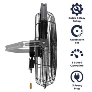 The 18 in wall-mount fan is an economical and reliable solution for workshops, garages and barns where floor space is limited or when overhead circulation is required. The fan head tilts 180 deg to control the airflow direction and a 3-speed pull chain provides further customization.