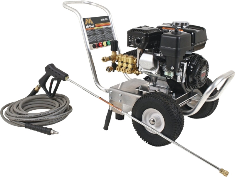 Aluminum pressure washer is lightweight, yet durable unit that is also extremely easy to handle. The engine has low oil protection and a direct drive triplex piston pump with ceramic plungers, adjustable pressure and a forged brass manifold. 2400 psi, 2.4 gpm, 196 cc engine is Honda OHV, 39 x 20-1/2 x 24-1/2 in, weight 73 lb. Includes thermal relief valve, stainless steel and brass unloader, in line water strainer, insulated trigger gun with safety lock off and a 36 in lance with rubber grip. Rental.Item Specifications