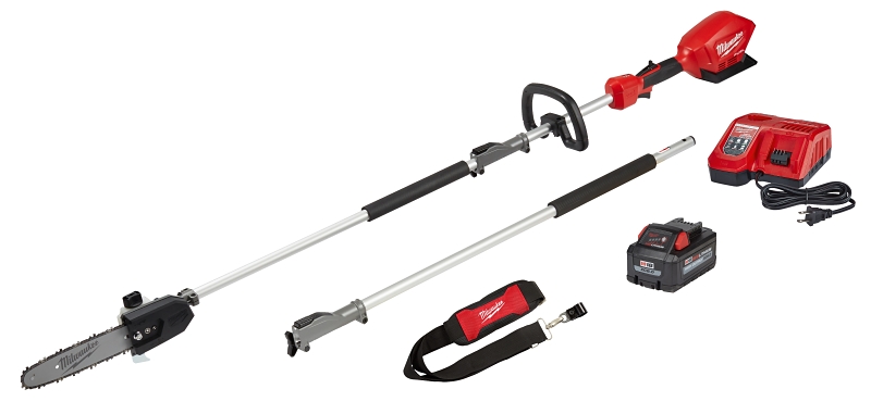 Designed to meet the needs of landscape maintenance professionals, our M18 FUEL⢠10 in pole saw with QUIK-LOK⢠kit gives you the power to cut hardwood branches, reaches full throttle in under 1 s and delivers up to 150 cuts per charge. The cordless pole saw is made up of two components the M18 FUEL⢠power head with QUIK-LOK⢠and QUIK-LOK⢠10 in pole saw attachment. This M18 FUEL⢠power head, part of the M18 FUEL⢠QUIK-LOK⢠attachment system is compatible with multiple attachments such as an edger, articulating hedge trimmer and string trimmer attachment. This gives you the ability to quickly swap out attachments on a single power head, delivering ultimate versatility and a lower cost of ownership. The POWERSTATE⢠brushless motor gives you the power to maintain its speed in demanding applications without bogging down, outperforming higher voltage systems. The motor is positioned in the rear of pole saw to provide the best combination of power, balance and maneuverability. REDLINK PLUS⢠intelligence gives you maximum performance and protection from overload, overheating and over discharge. The advanced electronic package also delivers instantaneous throttle response and a variable speed trigger giving you ultimate control over the power range. The M18⢠REDLITHIUM⢠HIGH OUTPUT XC8.0 battery gives you best in class performance in all applications and delivers up to 150 cuts per charge. Our M18 FUEL⢠10 in pole saw with QUIK-LOK⢠is part of the M18⢠system which is fully compatible with over 200 tools. In addition to the cordless pole saw the kit includes a 3 ft attachment extension, Shoulder Strap one of our M18⢠REDLITHIUM⢠HIGH OUTPUT XC8.0 batteries and an M18â¢/M12⢠rapid charger.Item Specifications