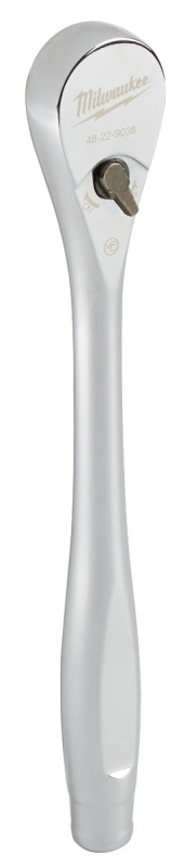 Our Milwaukee® 3/8 in drive ratchet gives users just 4 deg of arc swing, allowing them to access their work in tighter spaces whether is under the hood of a car or the middle of a remodel. Its slim profile design and the flush directional lever of the ratchet tool offers better accessibility while using it. The construction of the tool allows for greater fastener access as well as an increase in strength during heavy-duty applications. The all chrome finish allows for easy cleaning while giving the ratchet a professional look. Our ratchet is backed by our lifetime guarantee.Item Specifications