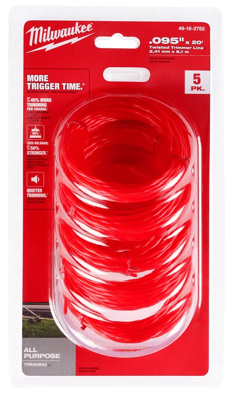 Home > Lawn and Garden > Lawn Power Equipment > Trimmer Accessories > Weed Trimmer Line > Milwaukee 49-16-2782 Trimmer Line, 0.09 in Dia, 20 ft L, Polymer, Red