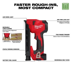 Our Milwaukee® M12 Cable Stapler delivers unmatched stapling performance in the most compact battery powered solution leading to a faster, more efficient rough in process. Our compact, lightweight design provides users with access to tight stud bays and improved ergonomics when stapling overhead or during difficult to reach situations. Moveable cable guides ensure proper alignment and the coil spring mechanism consistently sinks the staples to the appropriate depth when fastening NM-B Sheathed Cable (14, 12, 10 AWG) and low voltage cables, supporting peak stapling productivity. Only compatible with our 1 in insulated staples (sold separately), the M12 Cable Stapler gives the user the run time needed to sink up to 1,200 staples on a fully charged M12 CP 2 Ah battery.Item Specifications