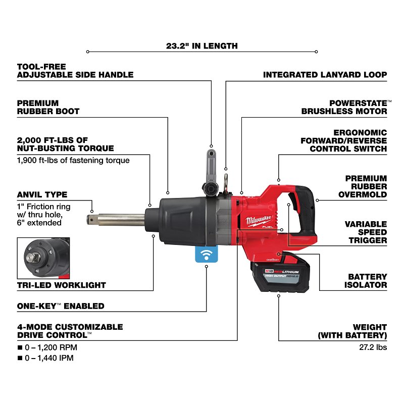 Our M18 FUEL™ 1 in D-Handle Extended Anvil High Torque Impact Wrench w/ ONE-KEY™ Kit is the world's first cordless 1 in D-Handle High Torque Impact Wrench. The POWERSTATE™ Brushless Motor delivers up to 2,000 ft-lb of nut-busting torque and 1,900 ft-lb of fastening torque, making this the world's most powerful cordless impact wrench, enabling you to complete the most demanding applications. With the run-time for up to 120 lug nut removals and installations on a single HIGH OUTPUT™ HD 12.0Ah battery, this portable impact wrench provides unmatched performance. Lug Nut Mode, which can be enabled through the ONE-KEY™ app, prevents the over-torque of lug nuts by automatically shutting off the tool, providing more control. The REDLINK PLUS™ Intelligence ensures you achieve maximum performance and protects the High Torque Impact Wrench against overloads, over-heating, and over-discharge. M18™ REDLITHIUM™ Battery Packs are compatible with all M18™ tools, providing this high torque cordless impact wrench with more work per charge and more work over the life of the pack. A patented battery isolation system manages high-frequency vibrations, enabling battery movement that prevents damage and ensures a constant connection between the battery and tool when in use. The 4-Mode DRIVE CONTROL™ provides you with greater control over the output speed and power of the MILWAUKEE® High Torque Impact Wrench. The ONE-KEY™ Technology allows you to customize, track, and manage the impact wrench with the ability to set a repeatable torque output for maximum control.