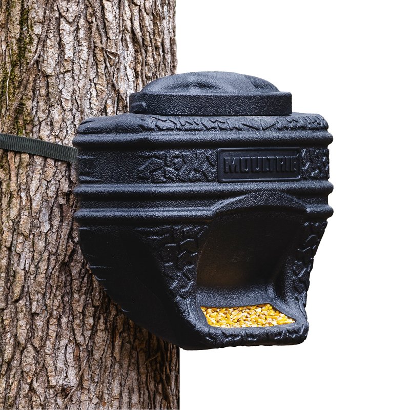 Feeding made simple. The feed bin is an affordable option for feeding deer and other wildlife without hassle. It easily attaches to trees via the included strap and no electronics or batteries are necessary. Feed drops to the singular front port via gravity and you can use a variety of feed types to cover the needs of your animals all year long. Molded slots help securely fasten the lid and drain holes keep water from pooling inside the hopper. The Feed Bin will hold up to one standard, 40 lb bag of corn.Item Specifications