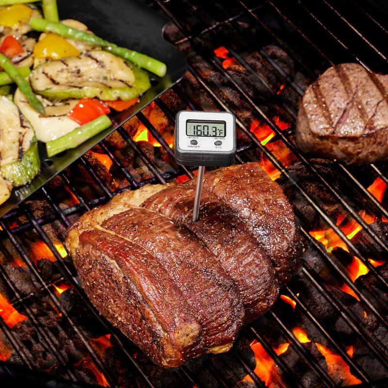 Mr. BAR-B-Q Meat Thermometer, Control Type: Button, Display Type: Digital, Stem Length: 4.8 in, Probe Material: Stainless Steel, Temperature Scale: Celsius, Fahrenheit, Power Source: Battery, Black, Includes: (1) LR44 Battery and Safety CoverItem Specifications