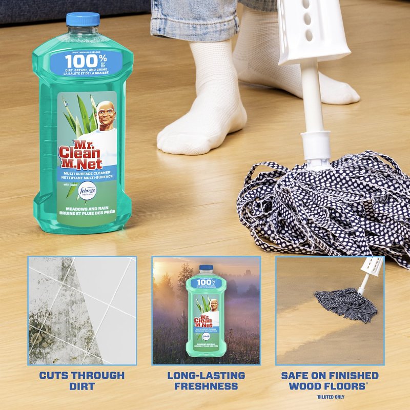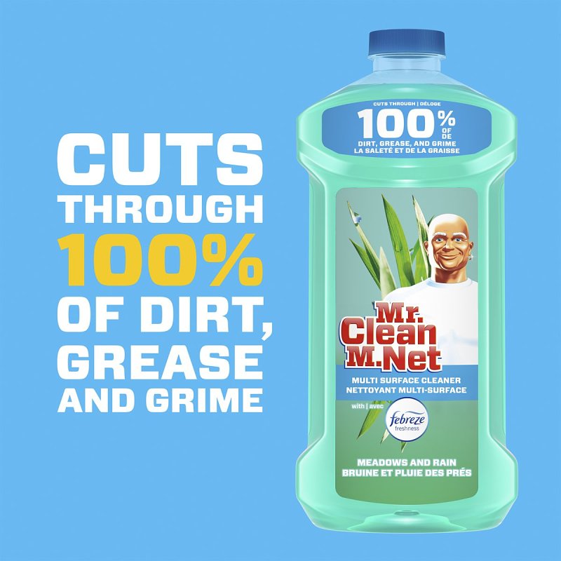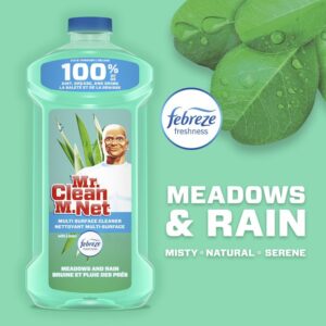 Get a powerful clean and a great scent with Mr. Clean's multi-purpose cleaner. It cuts through 100% of dirt, grease and grime, leaving the light, fresh scent of febreze Meadows and rain in its dirt-forsaken place. It works all around the house on everything from linoleum, to tile and finished hardwood floors, to toilets and bathtubs and even garbage cans.Item Specifications