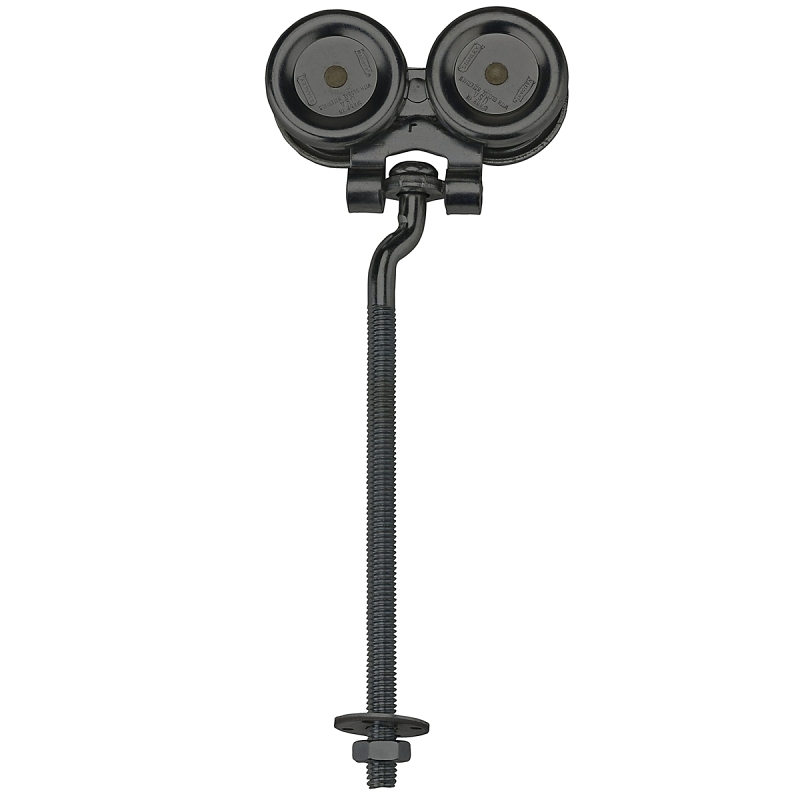 Designed for use with box rail on wood-frame, metal-clad door using a 2 x 4 in or 2 x 6 in frame. For use with #59, #5100, #5103, #5104, #5105, #5110, #5114 or #5116 box rail. Packed with four washers, four hex nuts and two end caps per pair. 1/2 in offset bolt adjusts both vertically and laterally from inside door. Connecting bolt threaded 7 in adjusts laterally 1 in by turning offset bolt for desired clearance. Durable one-piece, precision formed steel. Each hardened axle has 12 hardened and precision-ground alloy steel roller-bearings. Delrin seals keep out dirt while holding in long-life grease. Safe working load - 300 lb per hanger. 9 in bolt.Item Specifications