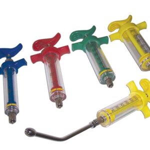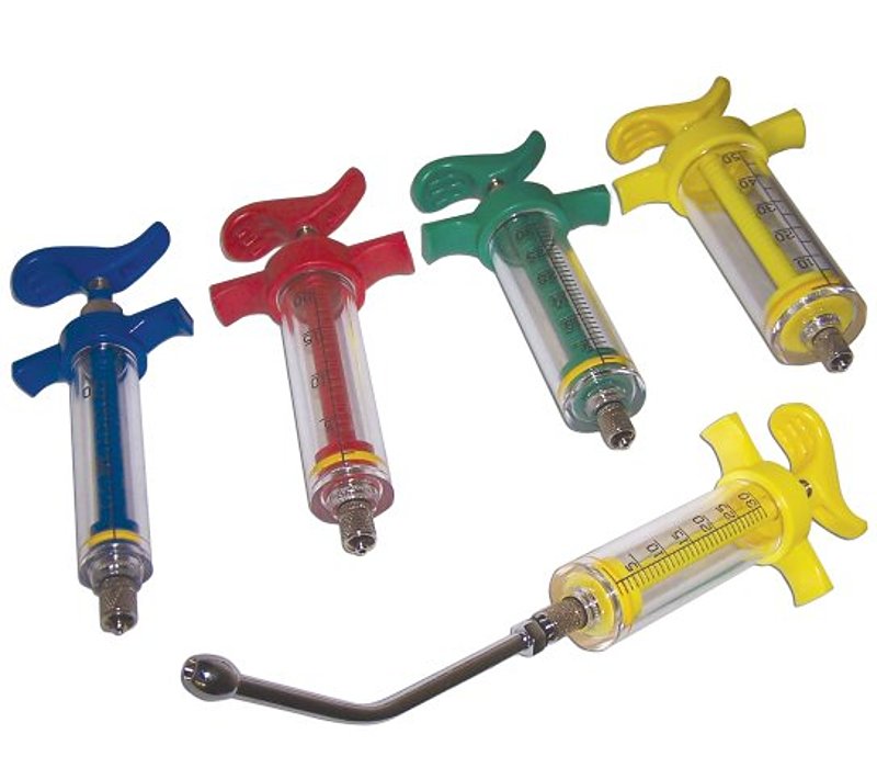 Durable nylon syringes are designed for one-hand operation and are easy to disassemble and clean. The syringes have a luer lock fitting and accept oral drench pipes.