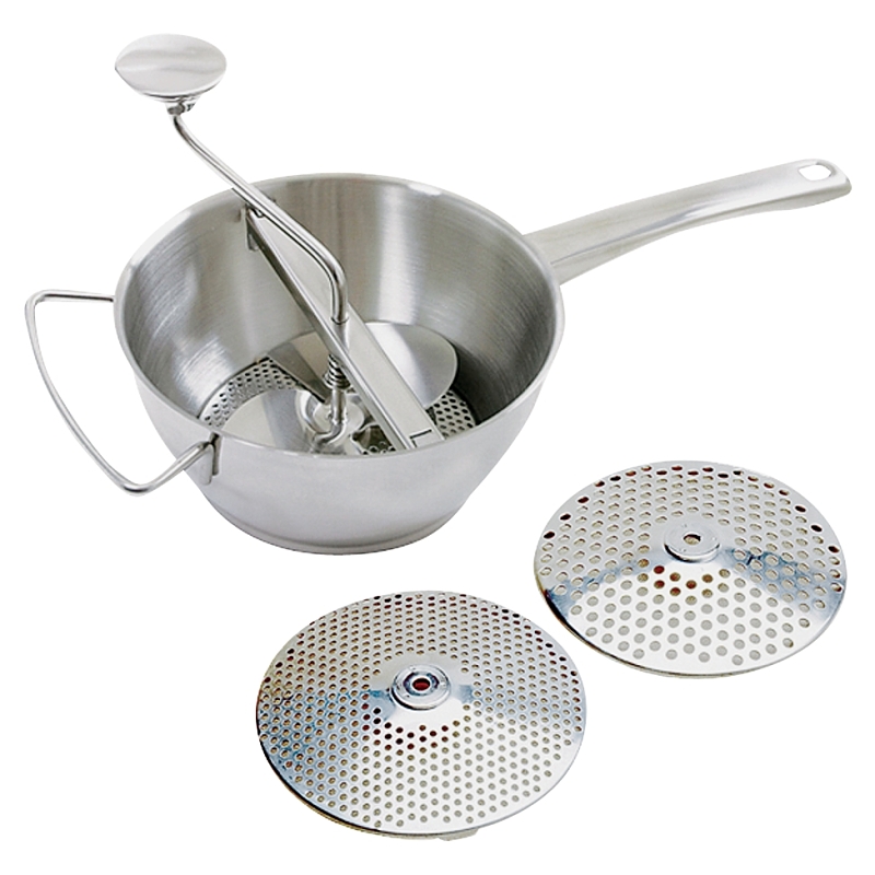 Ideal for fruits, vegetables sauces, purees and baby food. Made of 18/10 ga stainless steel. Use as strainer (sieve) separates skins and seeds from purees. Mash or rice potatoes. Comes apart for easy cleaning. Includes 2 discs: 3 mm ideal for smooth apple or tomato sauce; 5 mm ideal for a thicker sauce.Item Specifications