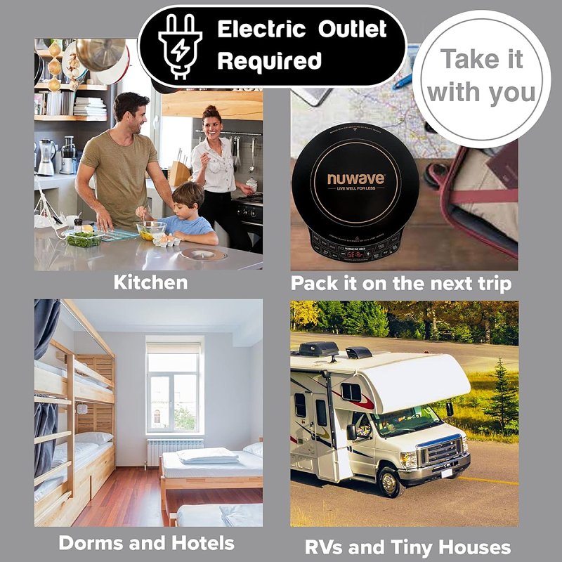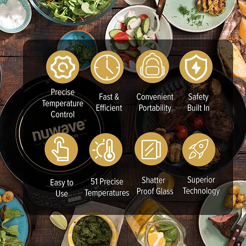 Offers precise temperature control with the simple press of a button. You can adjust the cooking temperature in 10 deg increments between 100 deg F and 575 deg F (Sear) for a total of 52 precise temperature settings. The PIC's induction technology heats the cookware directly, not the surrounding area. Utilizing 1500 W of power, the lightweight and portable PIC allows you to cook gourmet meals virtually anywhere. Offers state-of-the-art programming technology with 100 hrs of memory that allow you to program your favorite cooking procedures. A 10-1/2 in hard anodized Duralon healthy ceramic nonstick fry pan is included. Features 6 pre-programmed temperature settings, "Delay" and "Sear" functions, 1 hr default setting/Auto-Off, Multi-stage cooking, 1 hr "Resume" cooking timer, 12 in heat-resistant cooking surface, 8 in heating coil, Can change from deg F to deg C with the press of a button, Three wattage selections: 600/900/1500, Comes with Quick & Easy Cooking Guide, Instructional DVD & Complete Manual & Cookbook and a 35 in cord length.Item Specifications