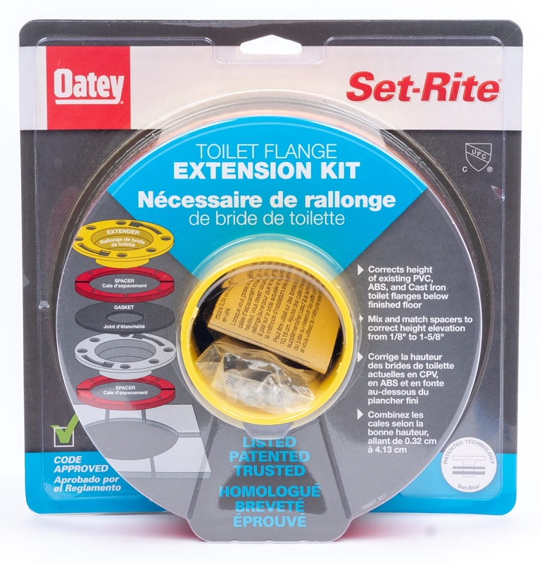 Oatey Set-Rite® products are designed for correcting elevations from 1/8 up to 2-1/4 in on existing PVC, ABS, metal or stainless steel flange rings, as well as cast iron flanges. The Set-Rite® toilet flange extension kit is the only patented, UPC listed and trusted solution acceptable for repair and renovation applications to restore the sealing surface of the flange.Item Specifications