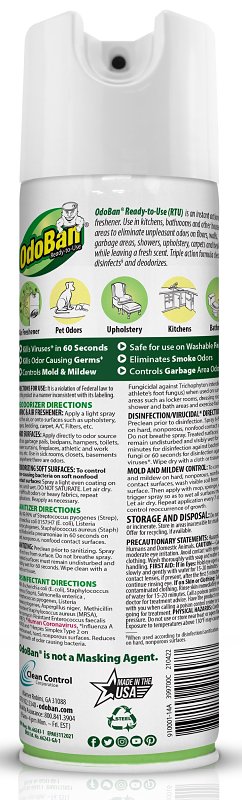 Odoban® ready-to-use continuous spray is our original multi-purpose formula. Odoban® disinfects, sanitizes, freshens and eliminates odors. Beloved by fans everywhere, this convenient and versatile spray is ready to tackle your biggest messes and odors. Leaves no residue. Features 360 deg pure air continuous spray technology to spray at any angle- even upside down. Made in USA.