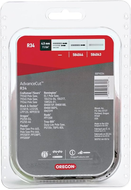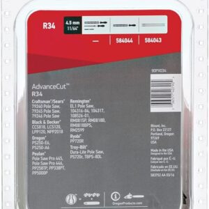 The Oregon R34 AdvanceCut⢠saw chain offers higher chain efficiency making it an ideal choice for landscapers and homeowners who use small, low powered saws. The 0.043 in ga narrow kerf cutting systems increase efficiency since they need less power from the saw than standard cutting systems.Item Specifications