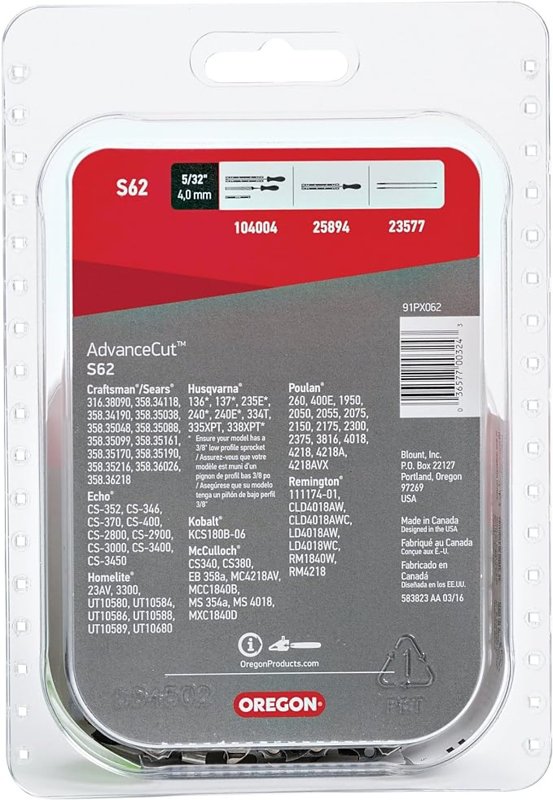 Semi chisel chain features top performing Chamfer Chisel cutters and a notched bumberdrive link for low kickback performance, good chip flow and a smooth cutting action. Twin corners of the cutters deliver great performance on the many popular saws which use low-profile 3/8 in pitch chain. Also features four way symmetrical tie straps which simplifies the joining of chain loops. Fits chainsaws made by Craftsman/Sears, Cub Cadet, Earthwise, Echo, Efco-Emark, Hitachi, John Deere, Milwaukee, Shindaiwa, Skil, Tanaka, Western Auto, WORX, Yardworks and others. Gauge for chain is 0.05 in.Item Specifications