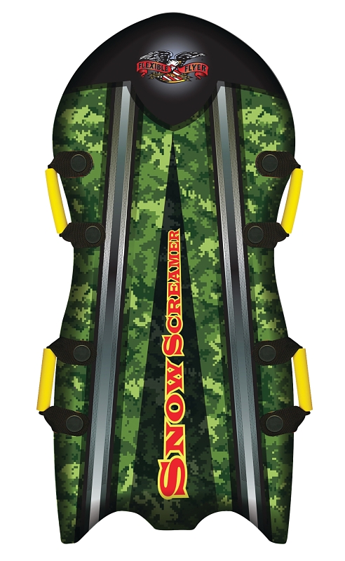 The flexible flyer snow screamer has modern looking graphics and a slick bottom for speed. Enjoy an exhilarating ride down the hill. It is big enough for one or two riders and it has four sturdy handles. This lightweight foam sled is made with polyethylene foam and has a soft foam construction. The laminated top and bottom is crack resistant, even in very cold weather. Since it's lightweight, it is easy to carry.