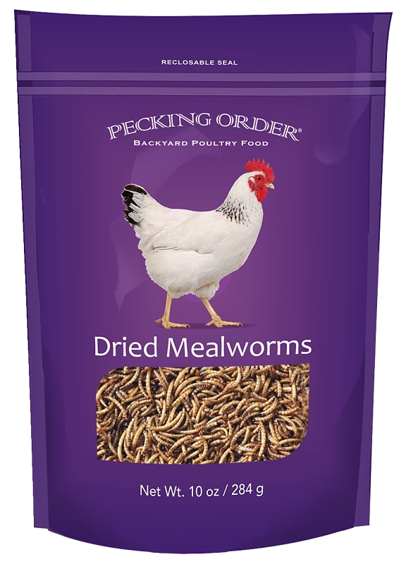 Pecking Order dried mealworms provide chickens and other poultry the irresistible high protein treat they love to eat. Offer dried mealworms before, during and after a molt to support feather growth or simply feed as a treat while interacting with your flock. What makes our dried mealworms extra special are the people that pack and prepare every bag of Pecking Order. Our team carefully inspects the mealworms at one of our US based packing facilities before being placed inside a Pecking Order bag. Try Pecking Order brand dried mealworms and feel confident you're giving your flock the very finest. Offering dried mealworms is a great way to interact with chickens and helps flock owners discover and enjoy the unique characteristics of each hen. Treats can also be effectively used on a routine basis to bring your flock in close for a quick visual inspection to evaluate their wellbeing.Item Specifications