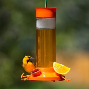 It's no secret that orioles have a sweet tooth. The Perky-Pet® fruit trio oriole nectar feeder allows you to serve three of their favorite foods in one convenient location. The large reservoir can hold up to 30 oz of nectar, which is accessible through four feeding ports around the feeder base. This unique feeder also includes a jelly cup and orange spike, which attach to the ports so you can serve up an orange slice and a sampling of jelly- two of orioles' favorite treats! Orioles won't be able to resist visiting this enticing feeder. The vibrant orange color makes this feeder hard to miss- orioles will easily be able to spot it as they fly nearby. When they stop to feed, the four large perches provide plenty of room for multiple orioles to rest while they dine on their sweet treats. To protect your nectar from insects, this oriole feeder comes complete with a built-in ant moat and bee guards. To use the ant moat, simply fill the top of the cap with water to prevent ants from crawling down the feeder to access the ports. For easy filling and cleaning, the Perky-Pet® fruit trio oriole nectar feeder features a convenient wide-mouth opening. Plus, the clear glass bottle allows you to easily monitor nectar levels at a glance so your orioles never run out! Use the built-in hanging hook to hang the feeder anywhere around your yard where you can easily view the bird-feeding action.