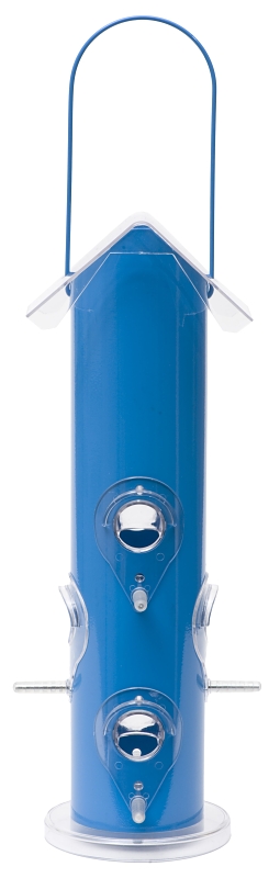 Add some color to your landscape with the Perky-Pet® blue metal tube bird feeder. This lovely feeder is a modern addition to your garden, backyard or patio. Easily fill the Perky-Pet® blue metal tube bird feeder with up to 1 lb of seed, place in a quiet and convenient place and watch as a variety of birds flock to your feeder. The blue metal tube Feeder is easy to fill, has removable parts for easy cleaning and is powder coated for rust resistance. This bird feeder includes a sturdy hanger for secure hanging and a roof to protect the seed from exposure to the weather. This feeder will complement any decor and also makes a great gift.Item Specifications
