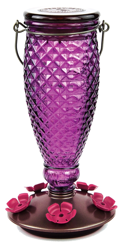 Presenting the patented top-fill feature you love with a stunning new color and glass construction, the Perky-Pet diamond wine top-fill glass hummingbird feeder is a favorite of birders and hummingbirds alike. The wide-mouth opening and top-fill design ensure that filling is always easy and mess-free. While you enjoy time saved from filling and cleaning, your hummingbirds won't be able to resist the feeder's lifelike hollyhock-inspired flowers. They are bright, soft and flexible just like the flowers they flock to in nature. The flowers' long stem design also acts as a natural bee guard to keep bugs out. Find the best seat in your house now, because hummingbirds are sure to be on their way.Item Specifications