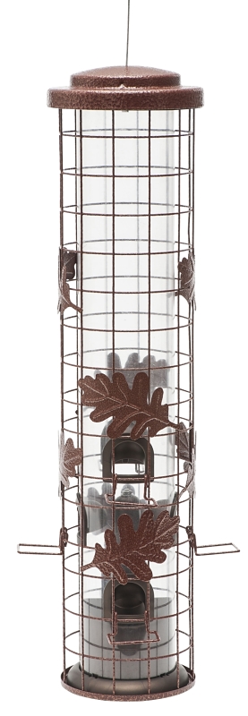 This Perky-Pet® Squirrel-Be-Gone® cylinder wild bird feeder features weight-activated seed protection and bird-preferred u-shaped perches. When a squirrel climbs on this feeder, its weight triggers ornate metal leaves to slide down and cover each of the six feeding ports to block the squirrel from feeding. The feeder's cage and leaf designs are finished with a rustic red powder coat, which protects the metal from the sun and weather elements. The Squirrel-Be-Gone® cylinder wild bird feeder includes U-shaped perches that allow birds to feed comfortably from multiple angles.Item Specifications