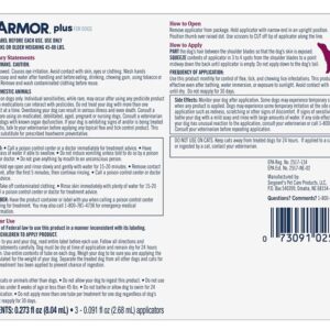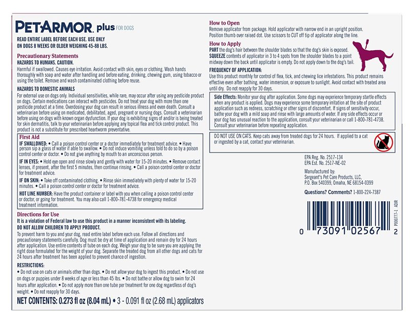 Your pets are family and PetArmor® helps you confidently care for your dog, especially when it comes to flea and tick control. PetArmor® Plus conveniently provides quality protection without the expense of a vet visit. PetArmor® Plus Flea & Tick Topical is a waterproof, fast-acting, long-lasting formula that kills adult fleas and ticks plus stops the flea cycle dead in its tracks. Get nose-to-tail 30 days protection with each dose at an affordable price. Protect your pet for less.Item Specifications